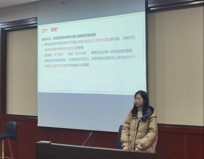 首先,罗晓、张芙榕、郑艳玲、金淑萍四位同志带领大家进行“党的十九届六中全会精神”专题学习。在学习分享中,首先讲到“三个需要”和“两个确立”的内涵,并阐述了党的百年奋斗的伟大历史意义和现实意义;接着,讲述了“十个坚持”、一个“根本问题”和“四个必须”;最后,罗晓同志热忱号召大家牢牢把握学习宣传的重要内容,切实从党的百年奋斗历程中汲取智慧和力量,把学习成果转化为强大学习和工作动力。
