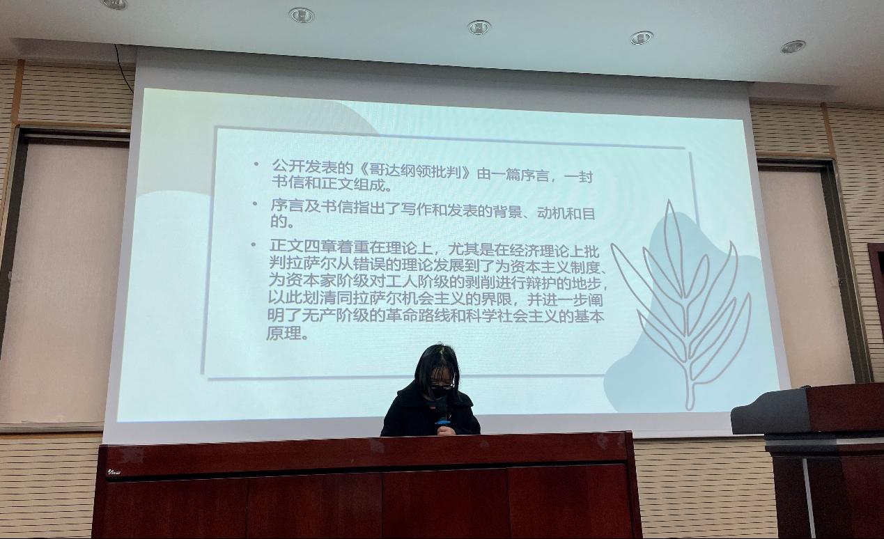 最后一本书是《哥达纲领批判》,由田淑慧同志分享,她首先介绍了这本书的写作背景是19世纪60年代,德国工业发展,工人阶级壮大,形成一支独立的政治力量。然后讲述了这本书背后的曲折故事,最后表示,《哥达纲领批判》在国际共产主义发展史上具有不可替代的作用。