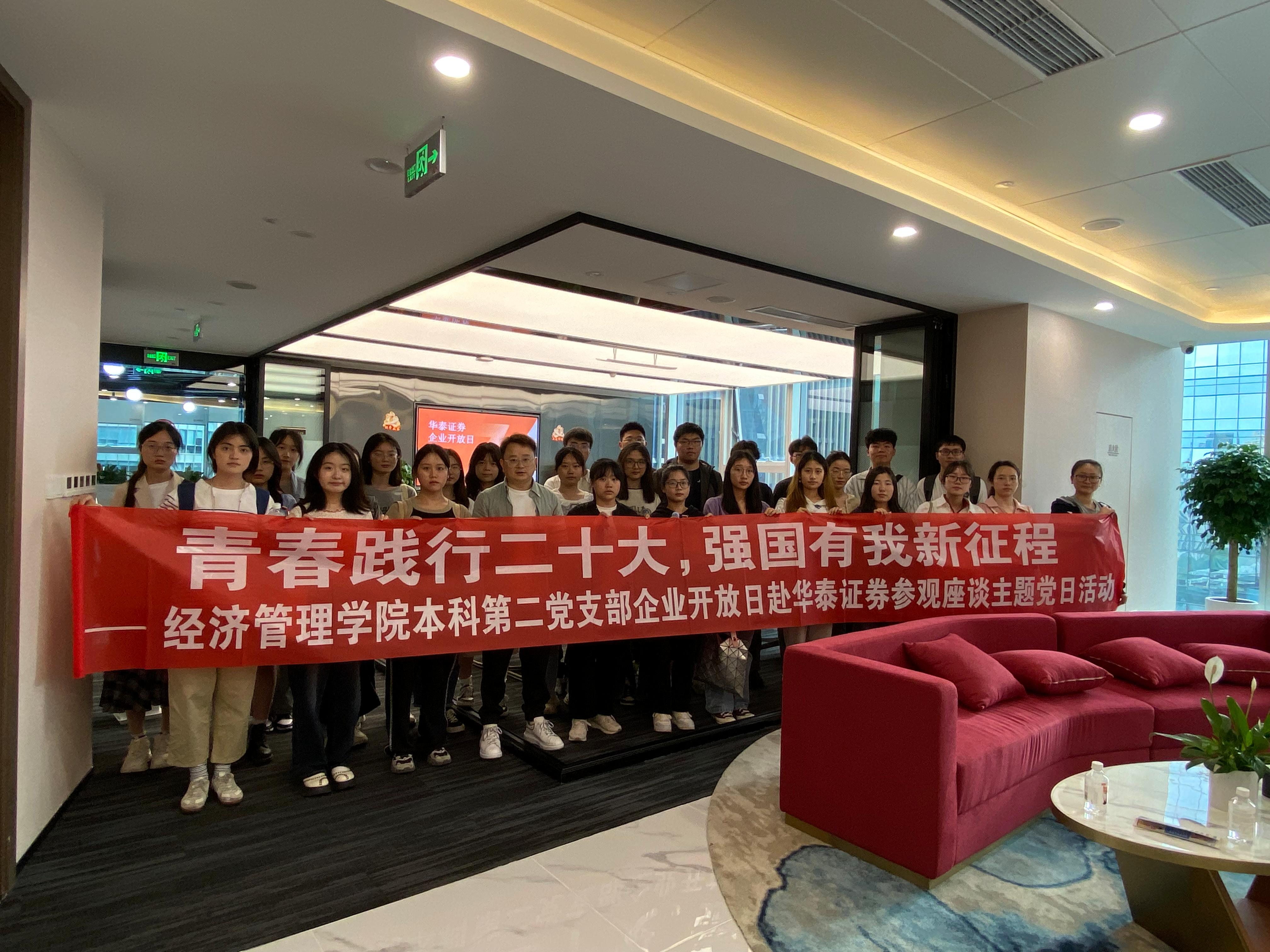 华泰证券的参访至此结束,大家一起合影留恋。本次参访内容充实、收获颇丰,让党支部金融专业的同学加深对券商公司、金融行业的了解,为同学们明确职业发展路径、提升就业能力提供了一次宝贵的学习机会。