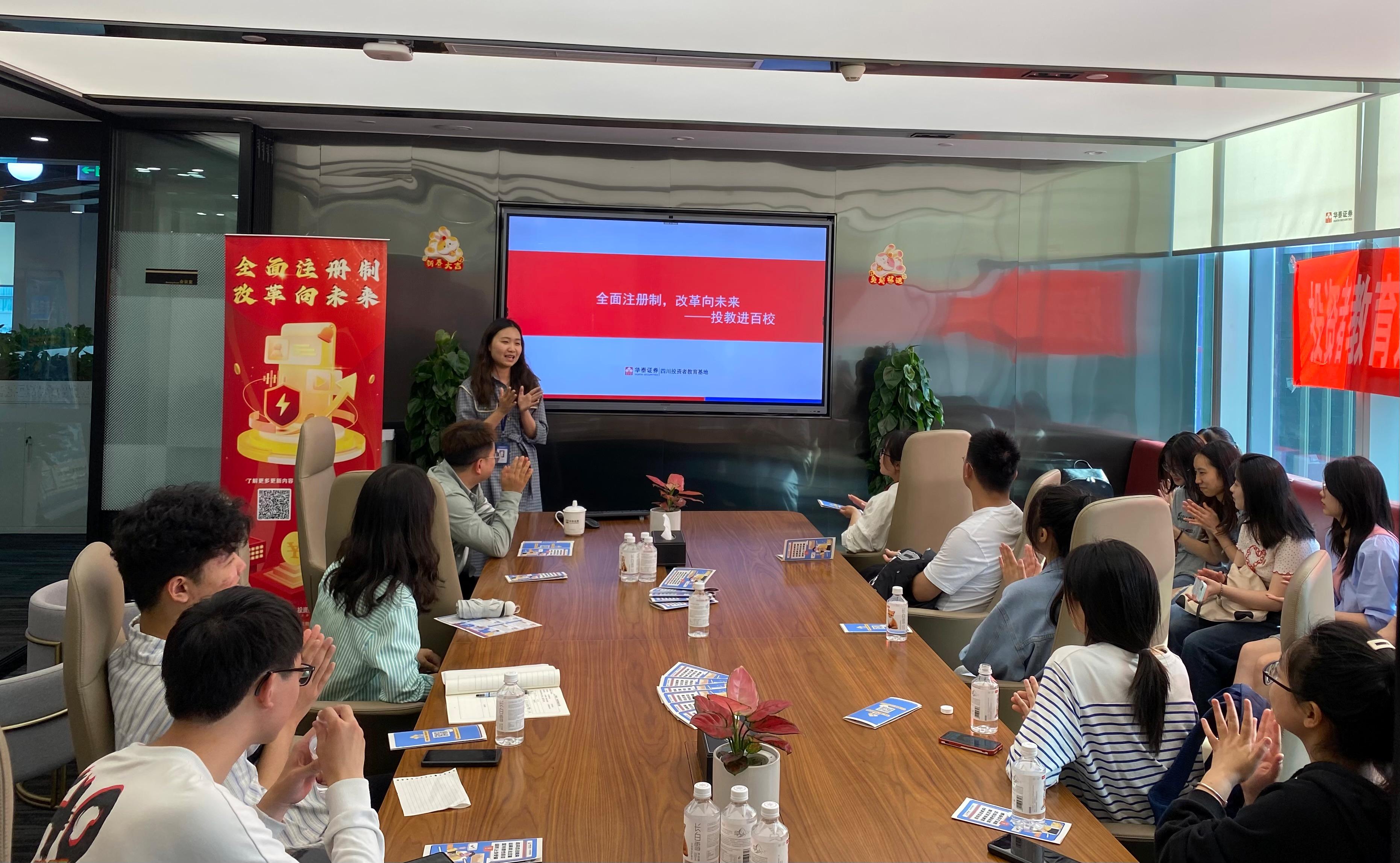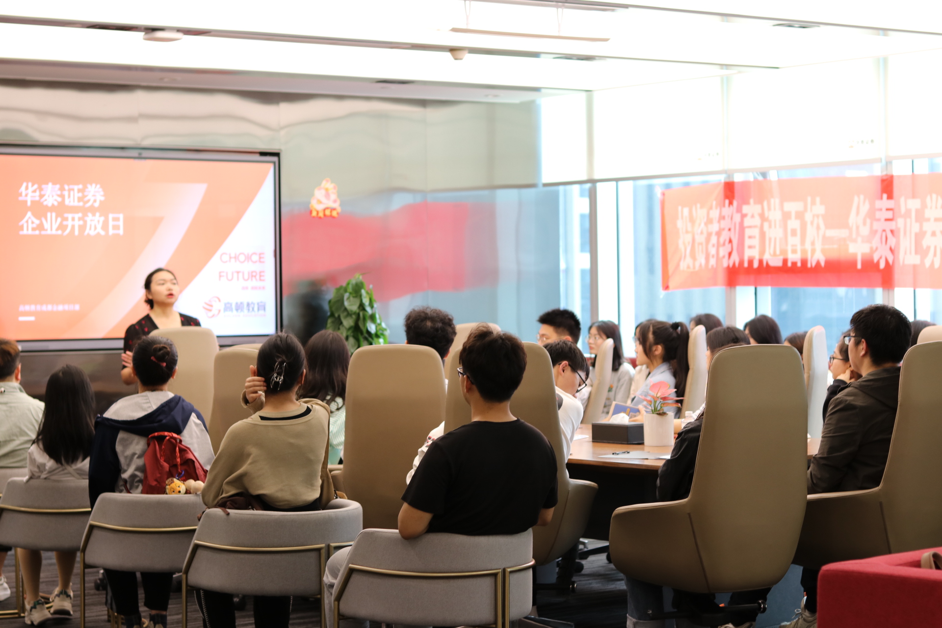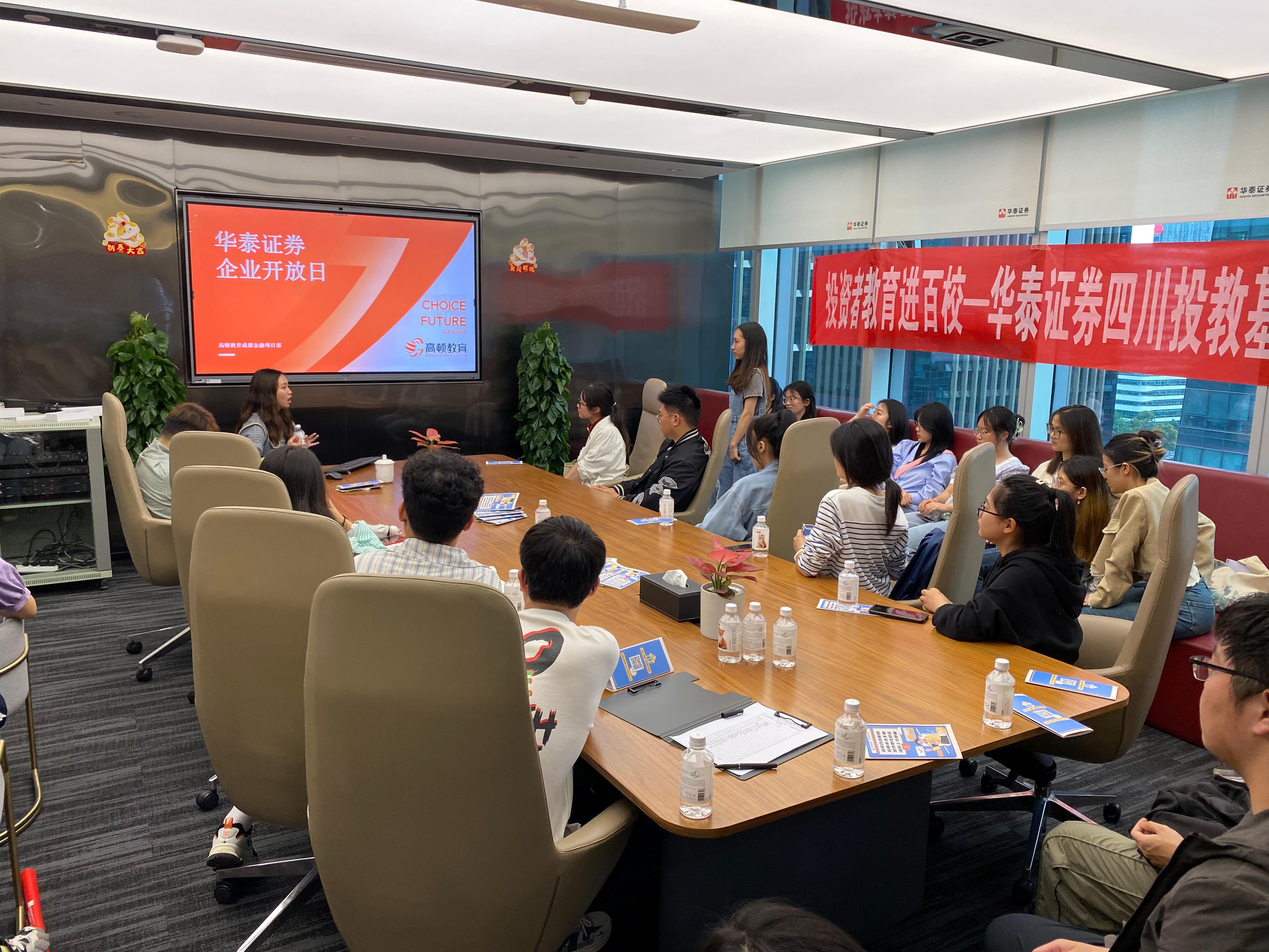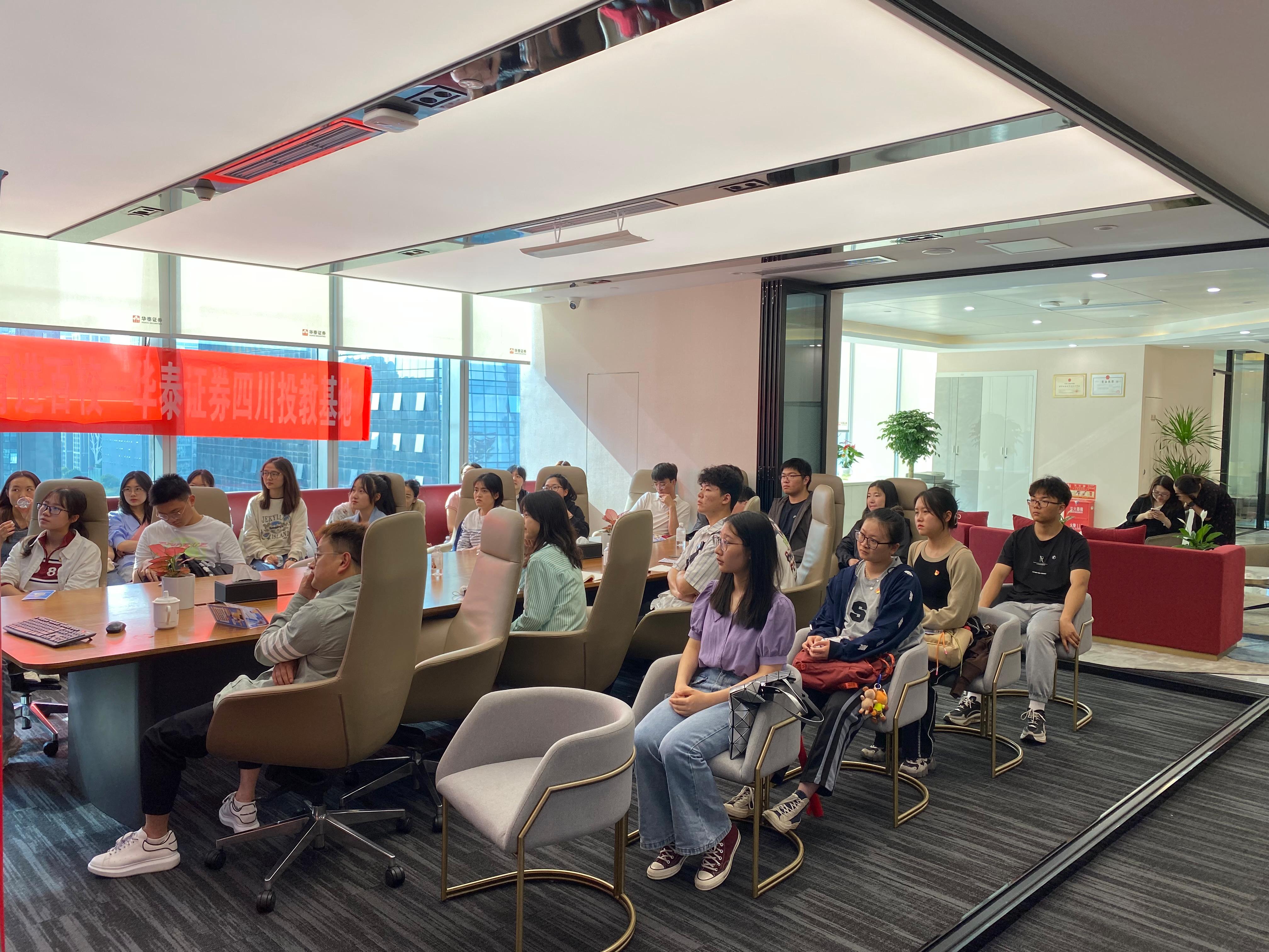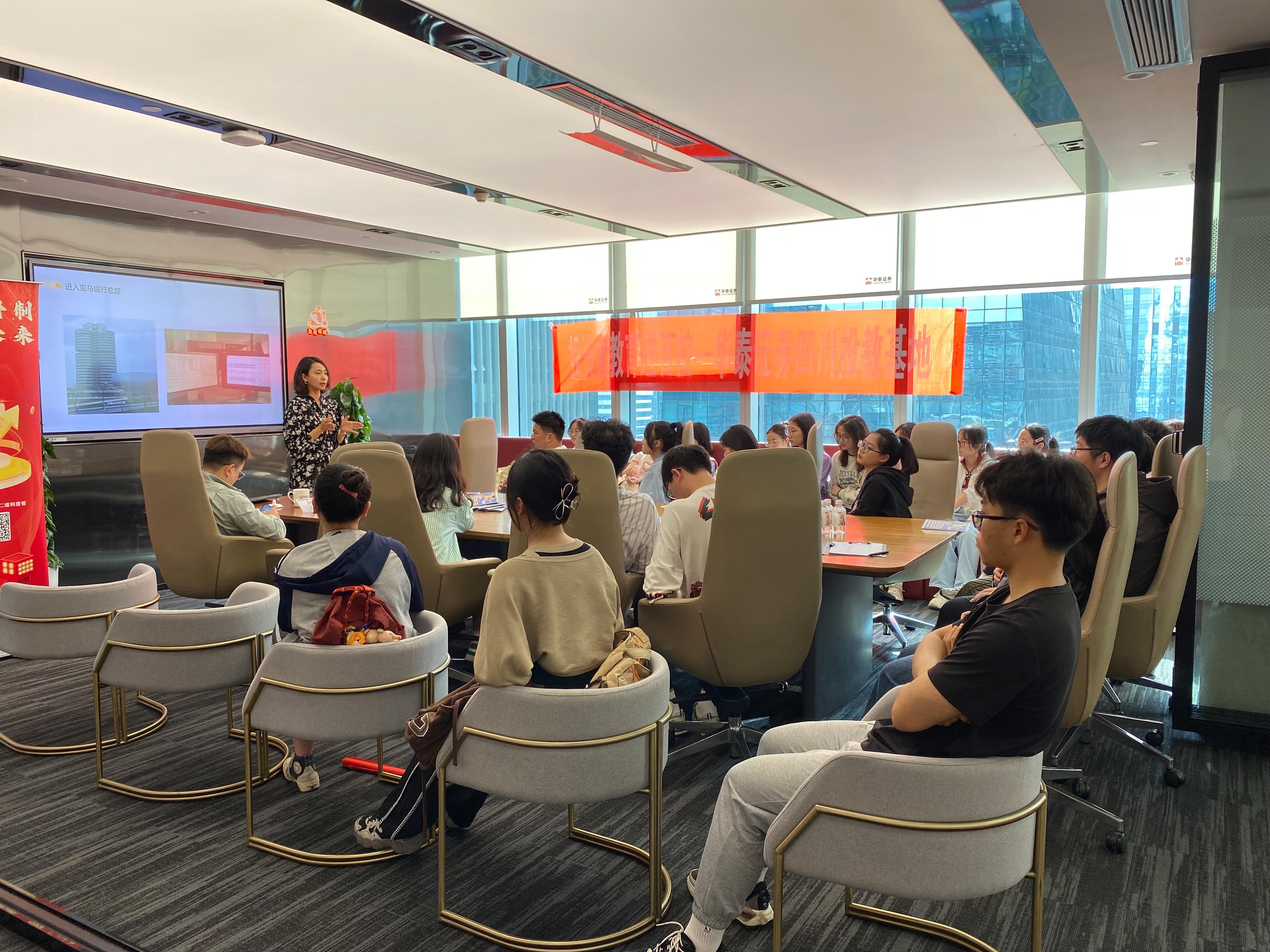 抵达华泰证券后,大家在老师们的带领下进入会议室落座。高顿教育和华泰证券公司的老师们对党支部的到来表示了热烈的欢迎,希望大家在今天的活动中能有所收获,随后简要介绍了此次活动的流程。本次参访交流活动正式开始。