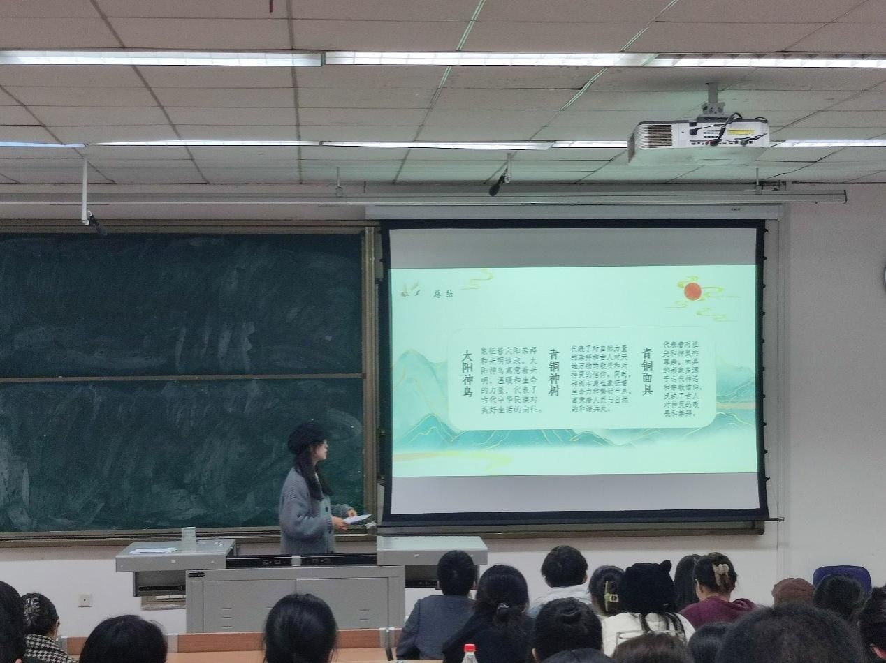 接着,张铭思甜和虞丽君结合自身前往三星堆博物馆研学的所见所闻和心得体会,与支部成员共同学习和探讨在新时代如何做好宣传思想文化工作。她们提到,在古埃及、古巴比伦、古印度和中国这四大文明古国中仅有我国的中华文明延续不断、经久不衰;作为新时代的青年,我们要坚定文化自信,紧跟党的步伐,增强担负文化使命的责任感使命感。