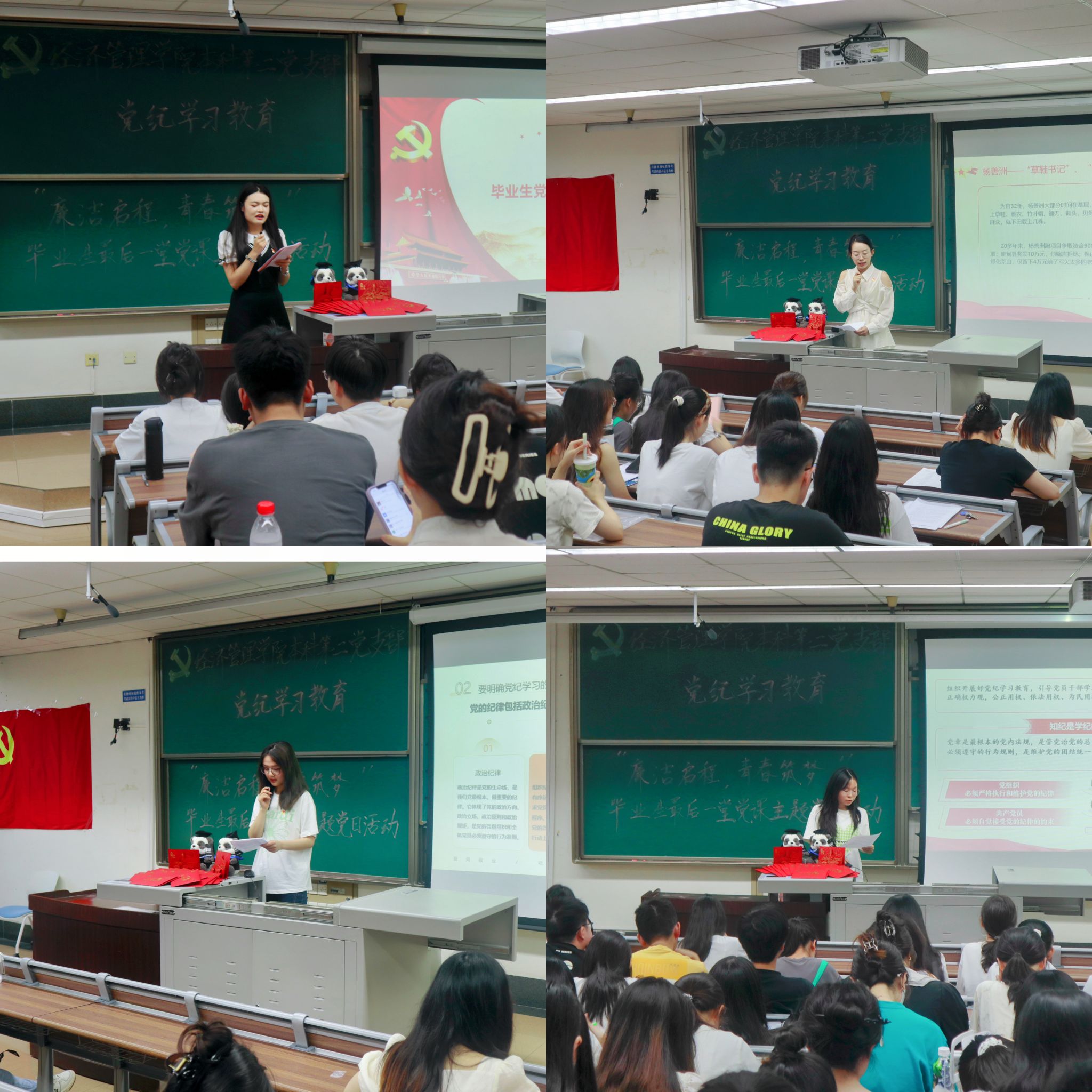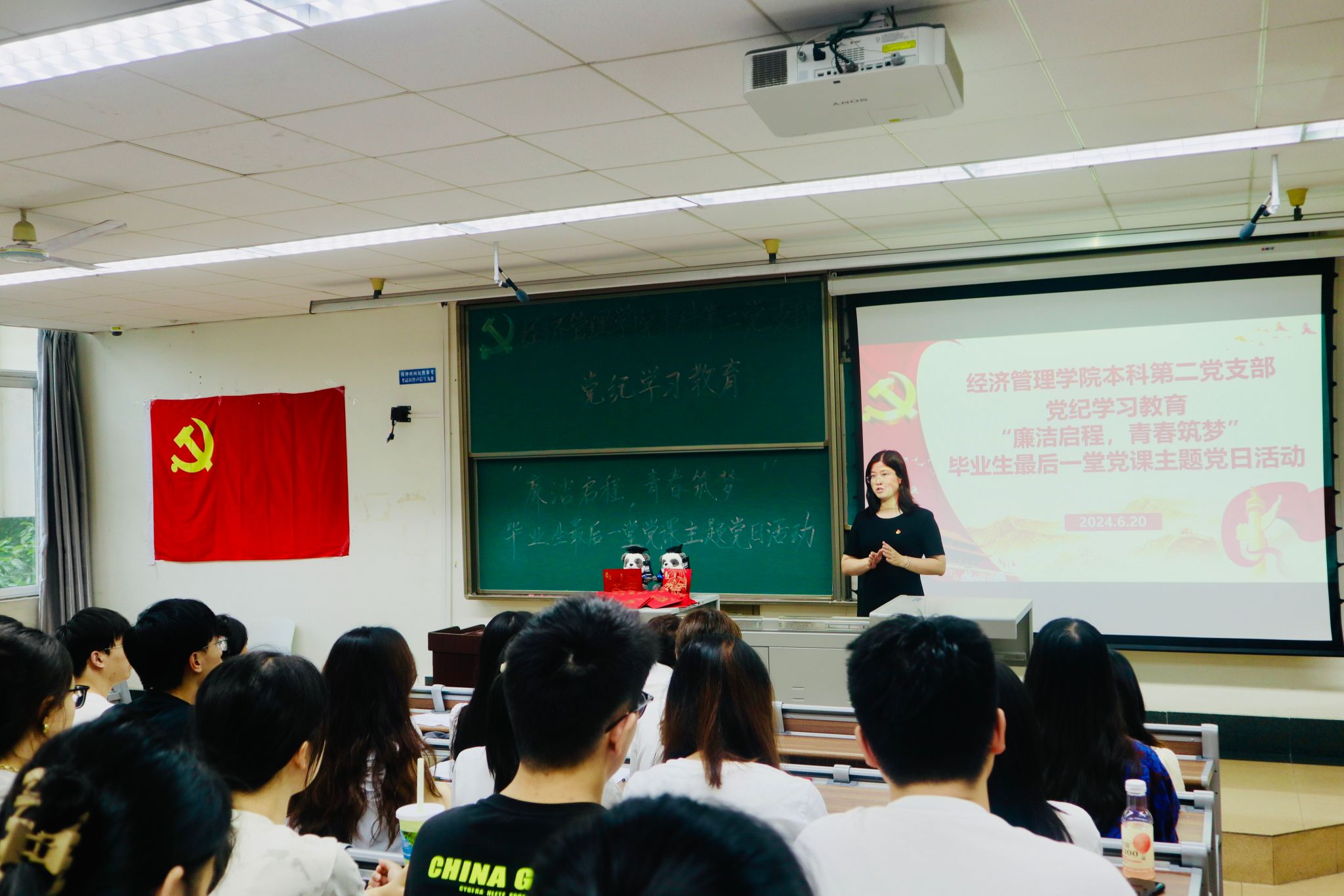 为深入学习贯彻习近平新时代中国特色社会主义思想和党的二十大精神,开展好党纪学习教育,进一步增强毕业生党员的党性意识和社会责任感,6月20日,色色动漫 本科第二党支部于J4310开展党纪学习教育——“廉洁启程,青春筑梦”毕业生最后一堂党课主题党日活动。