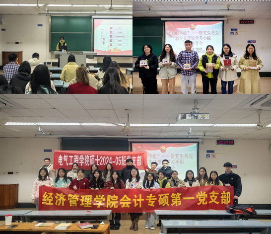 会计专硕第一党支部与电气学院电气硕士第五党支部在九里校区4407b教室联合举办了马克思主义理论读书分享会。会计专硕第一党支部陈心怡、何诗漫、刘畅畅同志与电气硕士第五党支部范银兵、保丹宇、刘燕同志分别分享了《实践论》《资本论》等马克思主义经典著作的相关内容,从理论的角度深入剖析了马克思主义的基本原理和核心观点,探讨了马克思主义在现实生活中的应用和价值。在自由讨论环节,两个党支部党员积极发言,就学习中的困惑和心得进行了深入交流。大家一致认为,通过本次读书分享会,进一步加深了对马克思主义理论的理解,增强了党性修养和责任感。此次活动为两个支部的党员们提供了一个展示学习成果和交流思想心得的良好平台,也进一步加强了支部的凝聚力和向心力。
