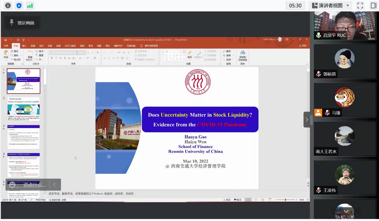 2022年3月10日上午10点,中国人民大学财政金融学院高昊宇副教授的学术讲座在线上举行。高昊宇副教授以“Does Uncertainty Matter in Stock Liquidity? Evidence from the COVID-19 Pandemic”为主题进行了精彩的分享。本次学术活动由色色动漫 马锋副教授主持,朱宏泉教授、梁超老师以及学院部...